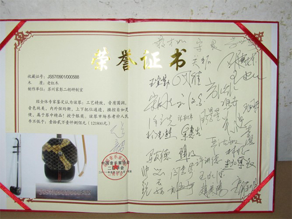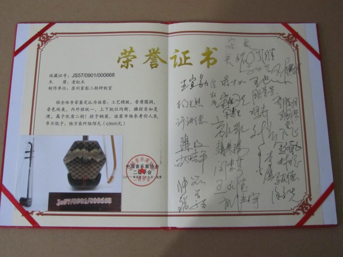 二胡制作大師丁家彭先生1949年出生樂(lè)器世家,17歲隨其祖父學(xué)琴藝,并深得精髓,其聰穎好學(xué),悉心鉆研與 探求二胡制作,博得同行的欽佩贊許,更得了許多知名演奏家的稱(chēng)贊,充分認(rèn)識(shí)到二胡制作每個(gè)環(huán)節(jié),都對(duì)二胡制作都有影響力,因此對(duì)二胡的選材,選料,蟒皮都十分嚴(yán)格,二胡整體穩(wěn)定性良好,環(huán)境干擾影響極小。